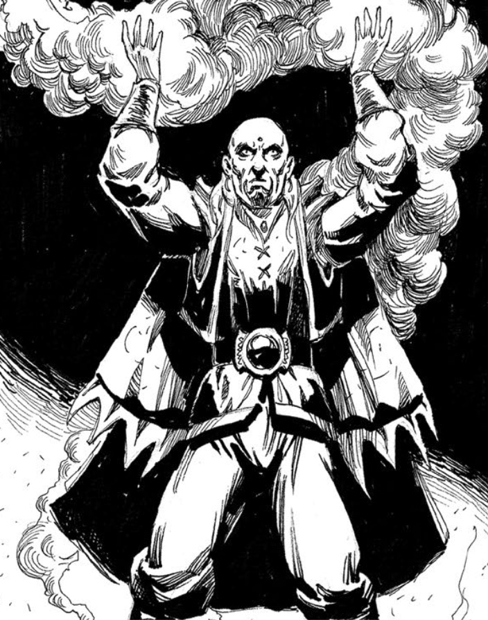 Del manual de Dungeon Crawl Classics Role Playing Game: Regarded as the wickedest of wizards ever to plague the Known World, Sezrekan the Elder was born to a peasant family and cursed with the knowledge of higher worlds. Straining to hear the music of the heavenly spheres, the aspiring wizard found only chaos and madness. Forsaking patron and liege alike, Sezrekan sought to free himself of the world and his mortal coil, regardless of the cost. Those who claim him as their patron are expected to follow in the Master’s footsteps, sacrificing kith and kin in the single-minded pursuit of mastery of self and thereby the multiverse. The Old Master has little regard for those that cannot help themselves, offering his aid only to spellcasters of proven dedication and talent.